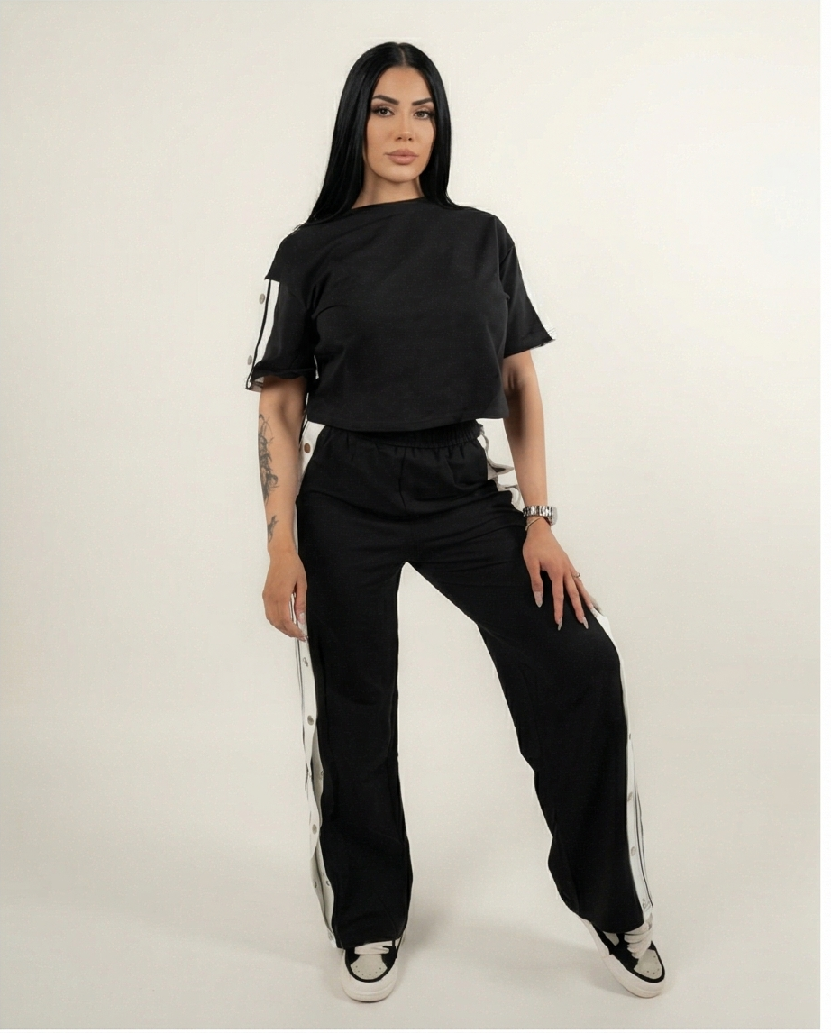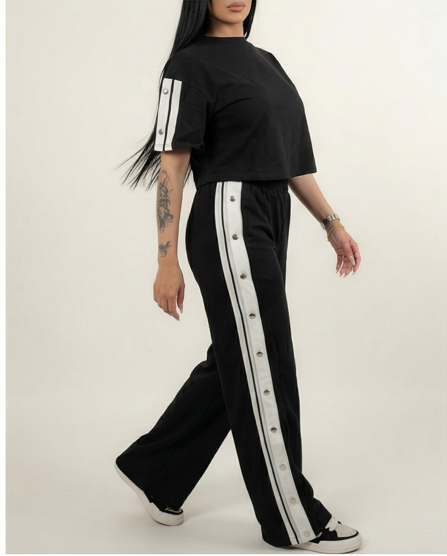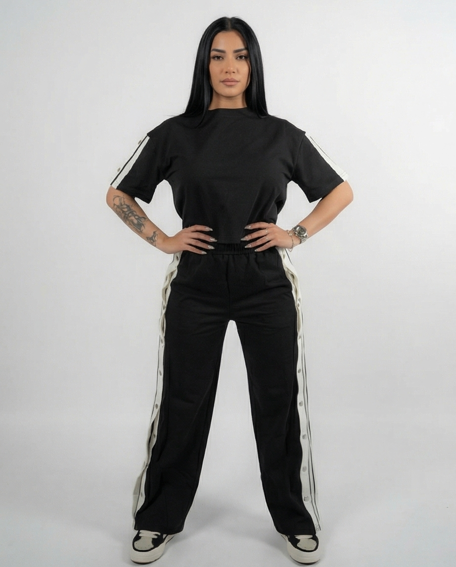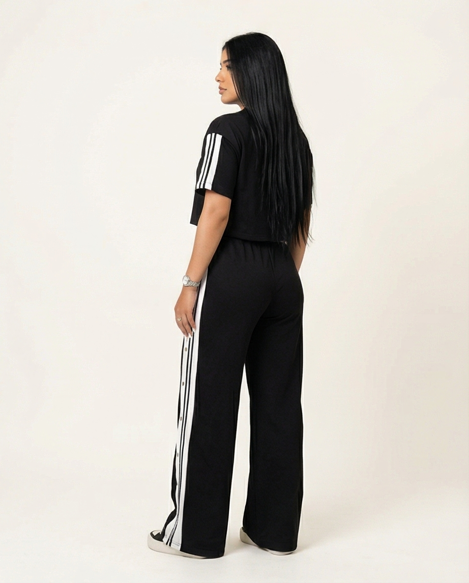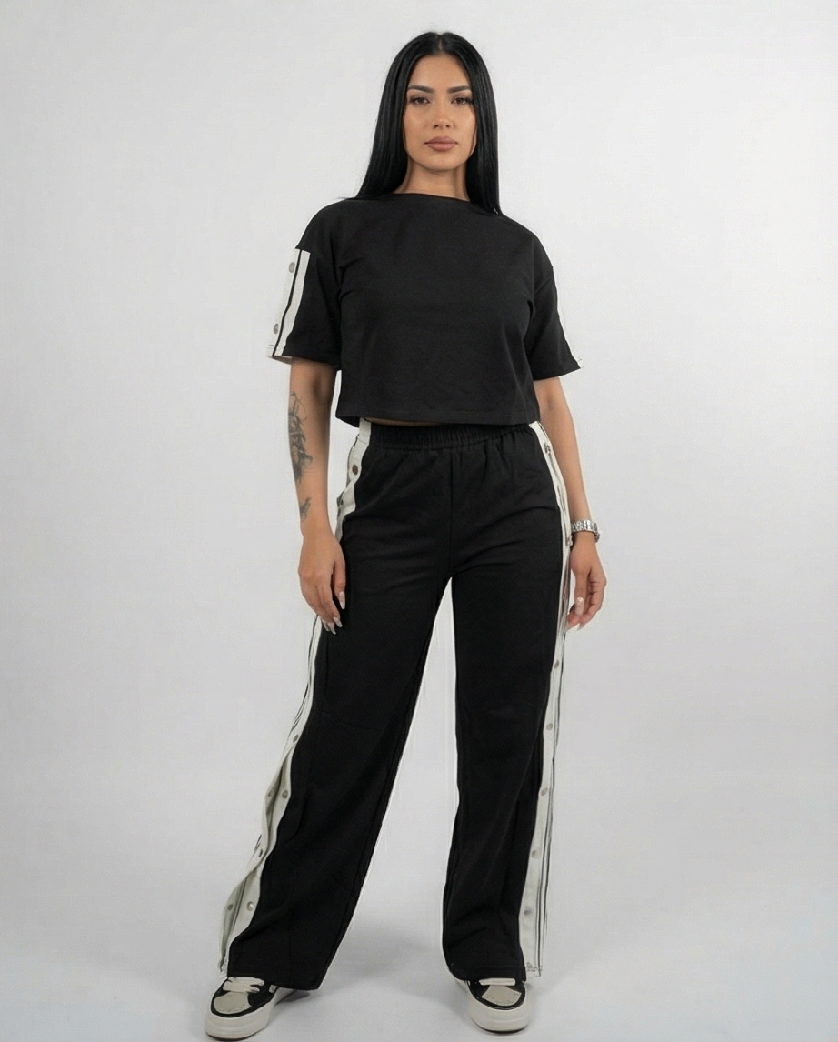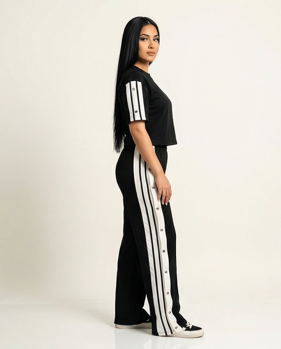 This two-piece features a cropped top and wide-leg pants with bold contrast side panels and snap-button detailing for a statement look that moves with you.